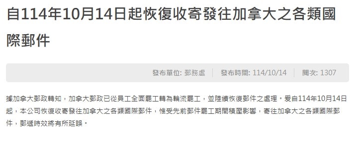 【最新訊息】自114年10月14日起恢復收寄發往加拿大之各類國際郵件